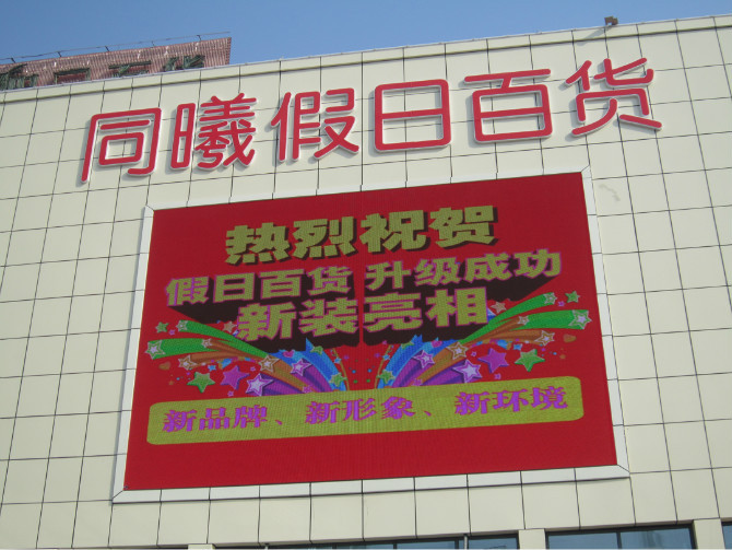 特色:四川成都同曦假日百货广场P16全彩LED显示屏,面积220平方米,采用1R1GB高亮度设计,采用台湾晶元芯片及台湾聚积驱动IC,亮度达7000CD/㎡以上,显示效果极佳,并得到用户的一致好评。