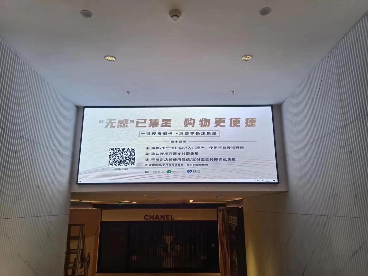 特色:江苏南京商场电梯口室内P1.86全彩LED显示屏,面积6余平方,采用铜支架灯珠,高刷6363驱动IC,创联电源,磁铁前维护安装,屏体点亮后效果极佳,并得到用户的一致好评。